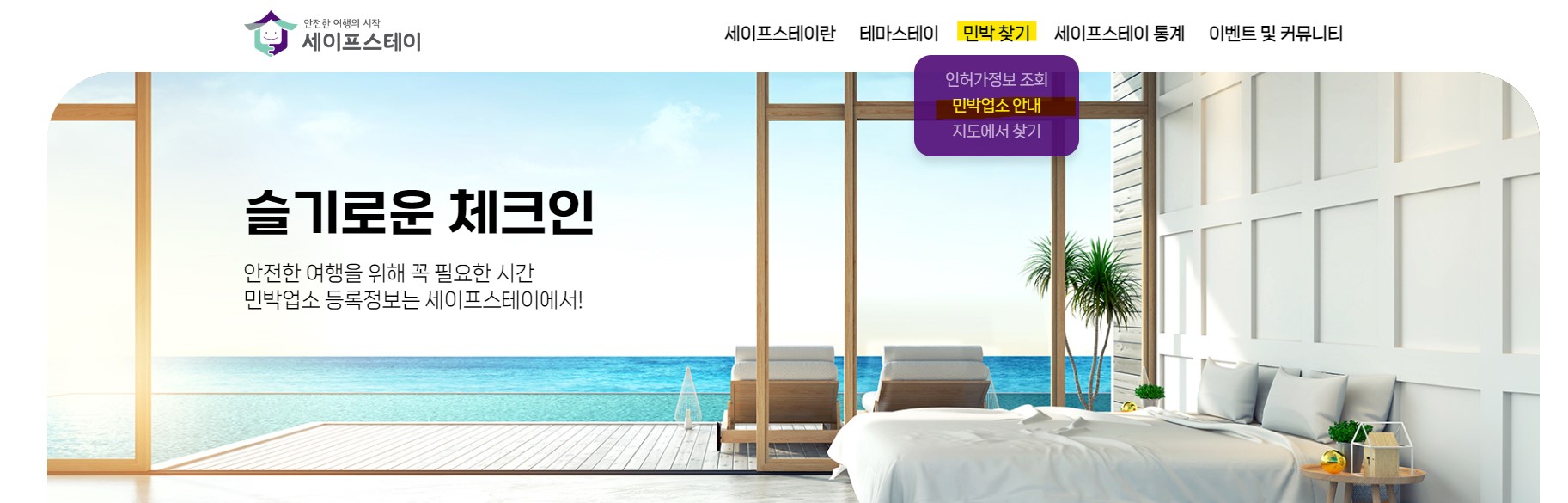 한국관광공사에서 안전한 숙박, 안전한 숙소 예약을 위해 진행하는 캠페인입니다. 세이프스테이는 합법 민박업소(인허가 숙소)를 이용할 수 있도록 돕습니다.