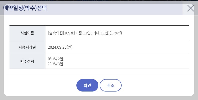 3. 최대 2박3일까지 선택하실 수 있고, [확인] 버튼을 누릅니다.