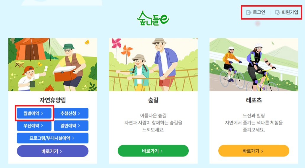1. 자연휴양림을 예약하려면 우선 <숲나들e> 홈페이지 회원가입이 필수입니다. 회원가입 및 로그인 후 [월별예약]을 눌러 예약 페이지로 이동합니다.